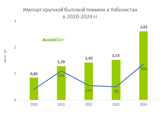 По данным «Анализа рынка крупной бытовой техники в Узбекистане», подготовленного BusinesStat в 2025 г, за 2020-2024 гг ее импорт крупной в страну вырос в 3,1 раза: с 0,8 до 2,6 млн шт. Основной вклад в увеличение показателя внес рост поставок из Китая (на 1,4 млн шт за пять лет).