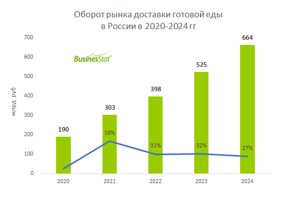 По данным "Анализа рынка доставки готовой еды в России", подготовленного BusinesStat в 2025 г, за 2020-2024 гг оборот этого рынка в стране вырос в 3,5 раза: со 190 до 664 млрд руб.