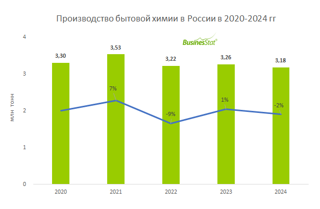 По данным «Анализа рынка бытовой химии в России», подготовленного BusinesStat в 2025 г, ее производство в стране в 2024 г снизилось на 2,4%: с 3,26 до 3,18 млн т. Развитие производства ограничивает дефицит импортных компонентов и комплектующих. К примеру, выпуск стиральных порошков зависит от наличия импортных энзимов и пеногасителей.