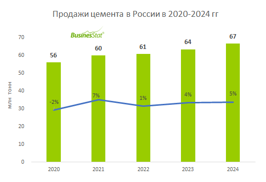 По данным «Анализа рынка цемента в России», подготовленного BusinesStat в 2025 г, в 2024 г его продажи в стране составили 67 млн т, что на 19% превысило уровень 2020 г.