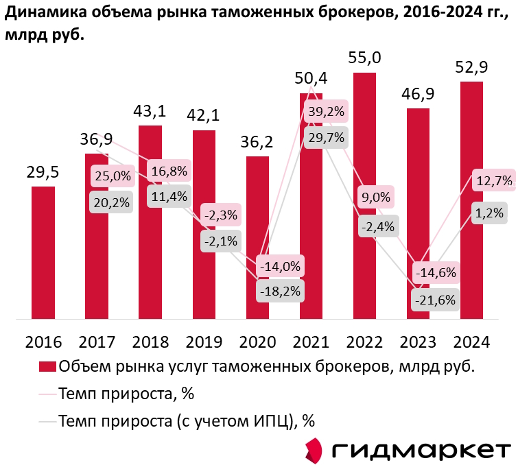 Таким образом, российский рынок таможенных брокеров за последние пять лет прошел через резкое падение в условиях пандемии, стремительный рост на волне восстановления, затем через новое снижение из-за санкционного давления. На 2024 год можно говорить лишь о стабилизации без выхода на устойчивую траекторию роста.