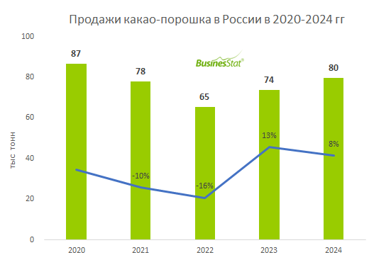 По данным «Анализа рынка какао-порошка в России», подготовленного BusinesStat в 2025 г, в 2024 г его продажи в стране выросли на 8% и составили 80 тыс т.