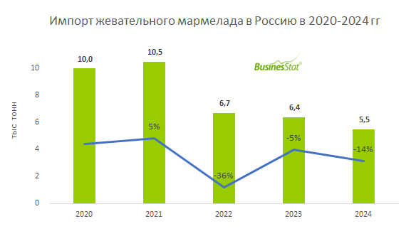 По данным «Анализа рынка жевательного мармелада в России», подготовленного BusinesStat в 2025 г, в 2021-2024 гг его импорт в страну сократился на 52%: с 10,5 до 5,5 тыс т.