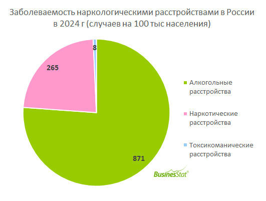 По данным «Анализа рынка наркологии в России», подготовленного BusinesStat в 2025 г, в 2020-2024 гг общая заболеваемость наркологическими расстройствами в стране сократилась на 5%: с 1 206 до 1 145 случаев на 100 тыс человек.
