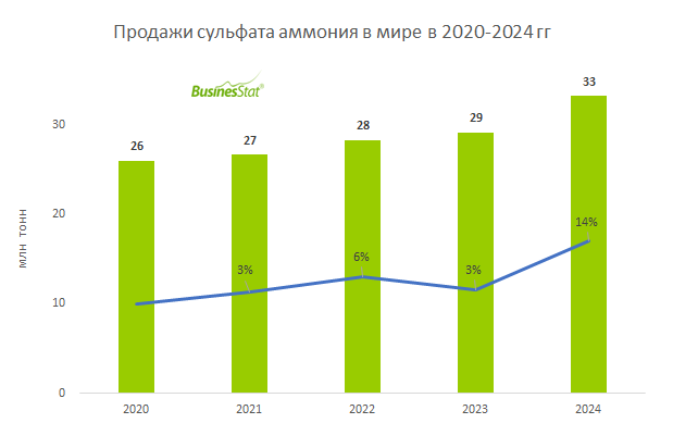 По данным «Анализа мирового рынка сульфата аммония», подготовленного BusinesStat в 2025 г, в 2024 г его продажи в мире выросли на 14%: с 29 до 33 млн т. Растущий спрос на азотные удобрения поддерживало повышение мирового потребления сульфата аммония. Постепенное снижение мировых цен на удобрения в 2023-2024 гг способствовало увеличению мировой торговли. Рост продаж поддерживался стабилизацией цен на аммиак и природный газ, решением проблем с логистикой, возникших в 2022-2023 гг.