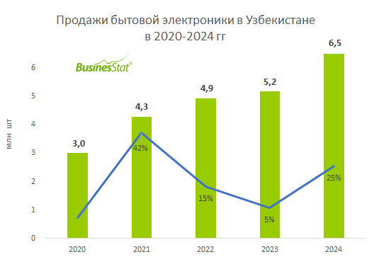 По данным «Анализа рынка бытовой электроники в Узбекистане», подготовленного BusinesStat в 2025 г, за 2020-2024 гг ее продажи в стране выросли в 2 раза: с 3 до 6,5 млн шт. В числе факторов роста рынка: увеличение численности населения и продолжающаяся урбанизация, развитие мобильной связи в стране, расширение электронной коммерции и доступа к интерактивным услугам, повышение спроса на электротехнику для удаленного формата работы и учебы.