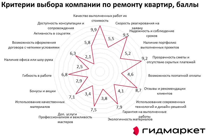 По данным оценки ГидМаркет, наиболее важными критериями выбора подрядчика остаются качество выполненных работ и их стоимость – 9,9 балла из 10 возможных. На втором месте – надежность исполнителя и соблюдение сроков (9,5 балла), что подчеркивает растущую нетерпимость клиентов к затягиванию проектов.