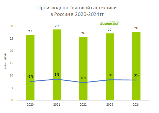 По данным «Анализа рынка бытовой сантехники в России», подготовленного BusinesStat в 2025 г, за 2023-2024 гг ее производство в стране увеличилось на 8% и достигло 28 млн шт различного оборудования.