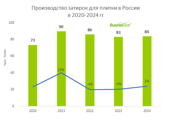 По данным «Анализа рынка затирок для плитки в России», подготовленного BusinesStat в 2025 г, в 2020-2024 гг их производство в стране выросло на 14%: с 73 до 84 тыс т.