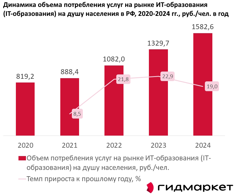 Объем потребления услуг на рынке ИТ-образования в пересчете на душу населения в России по итогам 2024 года составил 1582,6 рубля в год, что на 19% выше показателя 2023 года и на 46,3% выше уровня 2022 года.