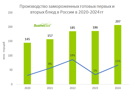 По данным "Анализа рынка замороженных готовых первых и вторых блюд в России", подготовленного BusinesStat в 2025 г, в 2024 г их производство в стране выросло на 11%: со 186 до 207 млн порций.