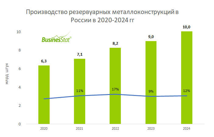 По данным "Анализа рынка резервуарных металлоконструкций в России", подготовленного BusinesStat в 2025 г, в 2024 г их производство в стране увеличилось на 12% до 10 млрд шт.