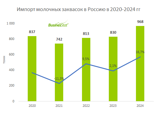 По данным «Анализа рынка молочных заквасок в России», подготовленного BusinesStat в 2025 г, в 2024 г их импорт в страну вырос на 17% и достиг 968 т.