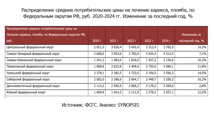 По данным «Исследования рынка стоматологических услуг», проведенного SYNOPSIS, на конец 2024 г самая высокая цена на лечение кариеса была зафиксирована в Северо-Западном федеральном округе – 4312 руб., что на 7,1% больше, чем годом ранее. За последний год наибольший рост цен на лечение кариеса наблюдался в Уральском ФО, на 14,5%.