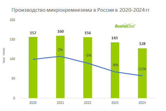 По данным «Анализа рынка микрокремнезема в России», подготовленного BusinesStat в 2025 г, за 2021-2024 гг его производство в стране снизилось на 20%: со 160 до 128 тыс т. Динамика выпуска зависит от состояния строительной отрасли как основной сферы применения.