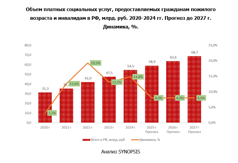 По прогнозу SYNOPSIS в ближайшие три года объем платных социальных услуг в РФ продолжит расти. При среднегодовом темпе роста на 8%, этот показатель может достичь 68,7 млрд. руб. к 2027 г.