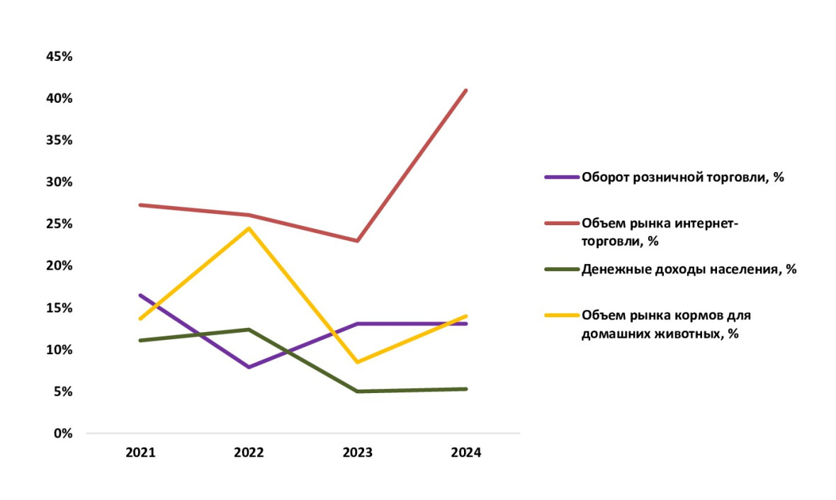 В ходе исследования, проведенного NeoAnalytics на тему «Российский рынок кормов для домашних животных: итоги 2024 г., прогноз до 2028 г.», выяснилось, что в целом ушедший год был достаточно благоприятным для российского рынка кормов для домашних животных. Динамика рынка опережала рост оборота розничной торговли, но уступала динамике электронной коммерции. При чем, в 2024 г. положение дел заметно улучшилось после замедления динамики в 2023 г. В анализируемый период 2021-2024 гг. пик роста пришелся на 2022 г.