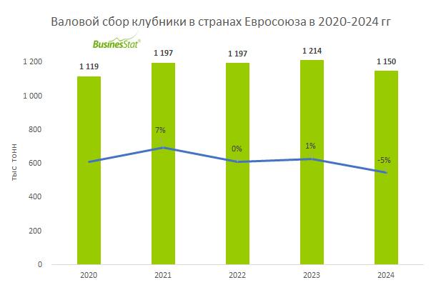 По данным «Анализа рынка клубники в странах Евросоюза», подготовленного BusinesStat в 2025 г, в 2024 г в Евросоюзе валовой сбор клубники снизился на 5%: с 1,21 до 1,15 млн т. Фермеры столкнулись с неблагоприятными погодными условиями. Сильные морозы, дождливая весна и переменчивая погода летом ухудшили объем и качество урожая в странах ЕС.
