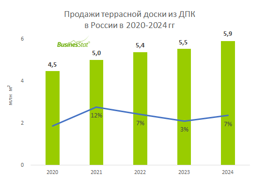 По данным «Анализа рынка террасной доски из ДПК в России», подготовленного BusinesStat в 2025 г, за 2020-2024 гг ее продажи в стране увеличились на 32%: с 4,5 до 5,9 млн м². Рынок относительно молодой, и потому пока не достиг насыщения: массовые продажи стройматериалов из древесно-полимерного композита в стране начались в 2010-х гг.