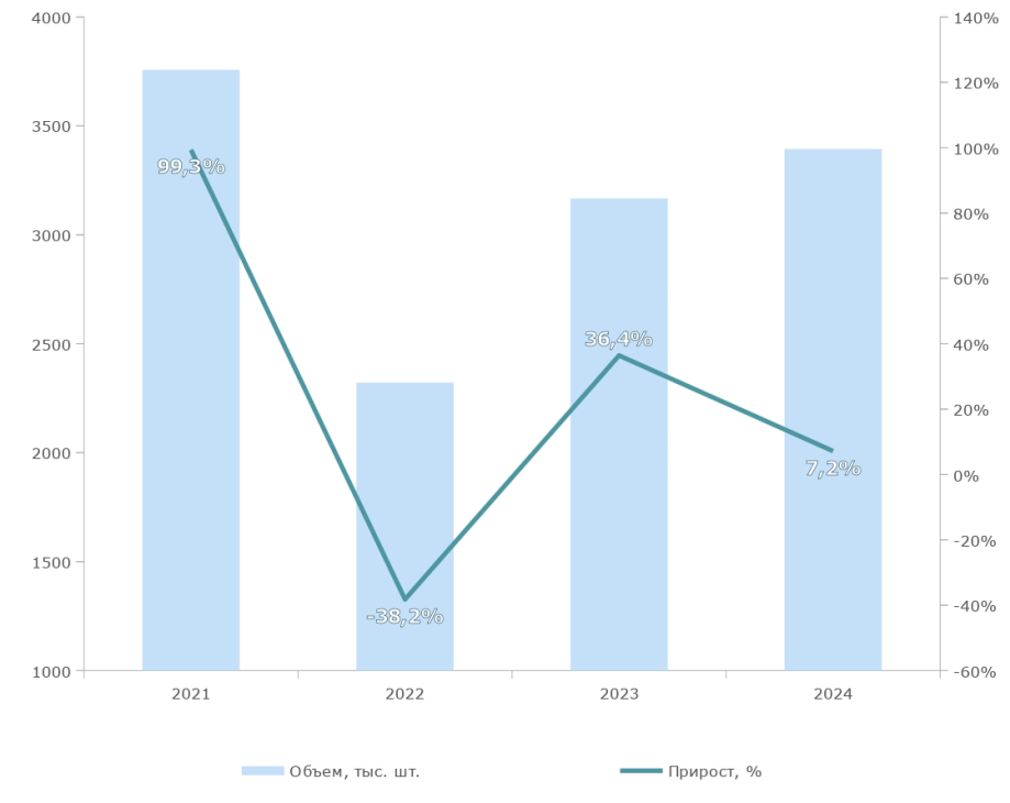 Уход иностранных компаний с российского рынка дал большой толчок наращиванию объемов производства отечественных коммутаторов. Так, в штучном эквиваленте показатель по итогам 2024 года увеличился в 2,6 раз относительно уровня 2021 года. В стоимостном выражении отмечается более выраженный рост выпуска — в 5,1 раз. Такая ситуация связана с активным увеличением стоимости российской продукции.