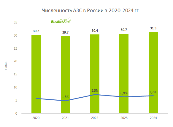 По данным «Анализа рынка автозаправочных станций (АЗС) в России», подготовленного BusinesStat в 2025 г, в 2024 г их численность в стране выросла на 2% и составила 31,3 тыс. Услуги по заправке топливом транспортных средств предоставляются как вертикально-интегрированными нефтяными компаниями, так и независимыми операторами.
