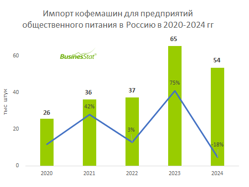 По данным «Анализа рынка кофемашин для предприятий общественного питания в России», подготовленного BusinesStat в 2025 г, в 2024 г их импорт в страну сократился на 18% до 54 тыс шт.