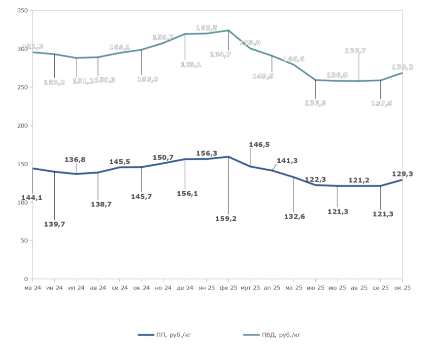 По итогам 10 мес. 2025 г. в РФ наблюдается выраженное снижение цен на базовые полимеры.