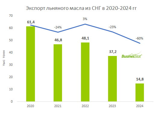 По данным «Анализа рынка льняного масла в странах СНГ», подготовленного BusinesStat в 2025 г, его экспорт из стран СНГ в 2024 г сократился на 60%: с 37 до 15 тыс т. Основное падение пришлось на Россию и Казахстан.
