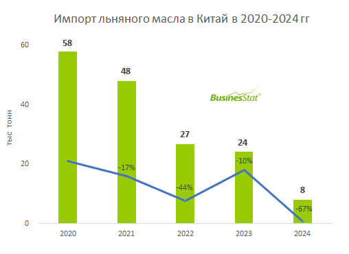 По данным "Анализа рынка льняного масла в Китае", подготовленного BusinesStat в 2025 г, в 2024 г его импорт в страну сократился на 67%: с 24 до 8 тыс т.