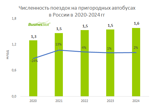 По данным «Анализа рынка пригородных автобусных перевозок в России», подготовленного BusinesStat в 2025 г, за 2020-2024 гг число поездок на пригородных автобусах выросло на 22%: с 1,3 до 1,6 млрд.