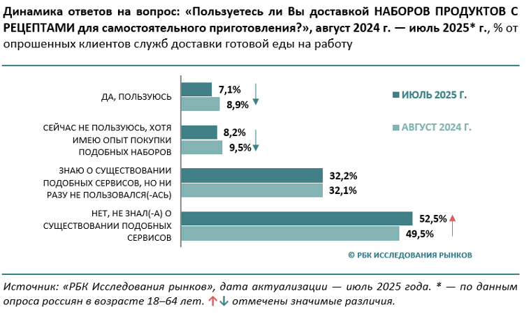 Ядром аудитории meal kits являются молодые и обеспеченные жители мегаполисов. Наиболее высокий уровень проникновения сервиса наблюдается среди потребителей 18–34 лет, а также в группе с доходом свыше ₽125 тыс. в месяц. Одновременно, в этих же группах зафиксирован и самый высокий отток клиентов. Согласно исследованию «Российского рынка доставки готовой еды 2025», 10,7% россиян 18-34 лет ранее заказывали наборы продуктов с рецептами, но сейчас этого не делают. А среди россиян с доходом свыше ₽125 тыс. в месяц так отвечали в 14,4% случаев.