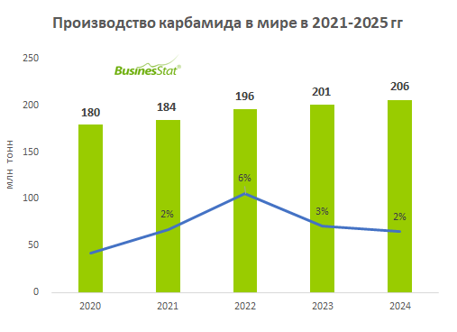 По данным «Анализа мирового рынка карбамида», подготовленного BusinesStat, за 2021-2025 гг производство карбамида в мире выросло на 14% до 206 млн т.