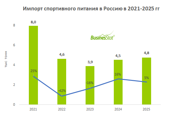 По данным «Анализа рынка спортивного питания в России», подготовленного BusinesStat, в 2024-2025 гг его импорт в страну увеличился на 22% относительно 2023 г и достиг 4,8 тыс тонн в 2025 г. Рост импорта обусловлен формированием новых логистических путей поставок, а также устойчивым спросом на зарубежную продукцию – главным образом на специальные продукты для профессиональных спортсменов, аналогов которым отечественные производители не могут предложить. При этом страновая структура импорта изменилась: если до 2022 г продукция ввозилась в основном из США и европейских стран, то в 2024-2025 гг в поставках преобладает спортивное питание из Китая.
