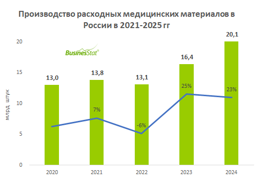 По данным "Анализа рынка расходных медицинских материалов в России", подготовленного BusinesStat, в 2025 г их производство в стране выросло на 23% до 20 млрд шт.