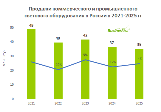 По данным «Анализа рынка коммерческого и промышленного светового оборудования в России», подготовленного BusinesStat, в 2025 г его продажи в стране снизились на 4% по отношению к 2024 г и составили 35 млн шт.
