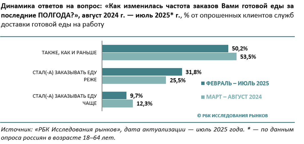 Однако общий баланс изменился в сторону снижения активности потребителей: по сравнению с прошлым годом доля тех, кто стал заказывать реже, выросла с 25,5% до 31,8%, в то время как доля увеличивших частоту заказов, наоборот, сократилась – с 12,3% до 9,7%.