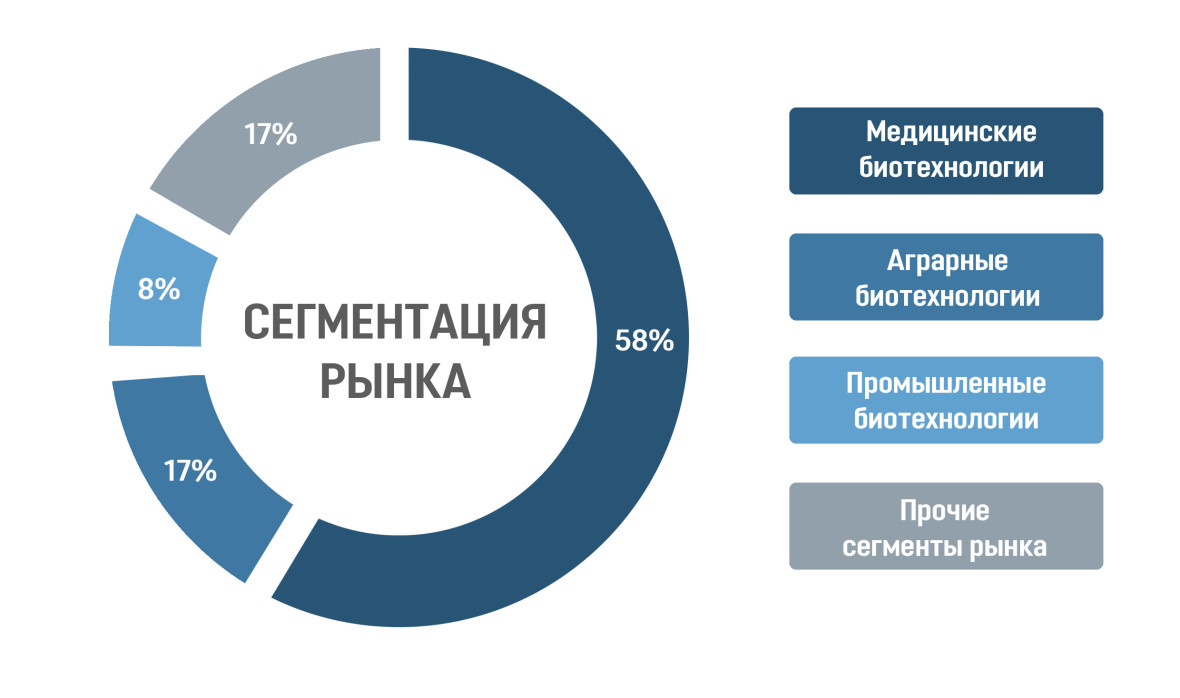 Российский рынок биотехнологий демонстрирует уверенный рост и становится важным элементом стратегии импортозамещения. В 2025 году оборот составил порядка 475 млрд рублей, увеличившись в два раза по сравнению с 2015 годом. Доля импортозамещенной продукции возросла с 15-20% до 40-50% в отдельных сегментах, что отражает активную государственную политику поддержки отечественных биотехнологий. Основным драйвером роста отрасли стало производство и экспорт биофармацевтических продуктов в контексте пандемии коронавируса (поставки в Индию, Аргентину, Китай, Беларусь и Бразилию). Кроме того, рост выручки был обусловлен повышением цен на биотехпродукцию на фоне санкционных ограничений и активизацией процессов импортозамещения в области биофармакологии. Российский рынок биотехнологий можно фрагментировать на 3 основных сегмента, каждый из которых характеризуется собственной динамикой и перспективами.