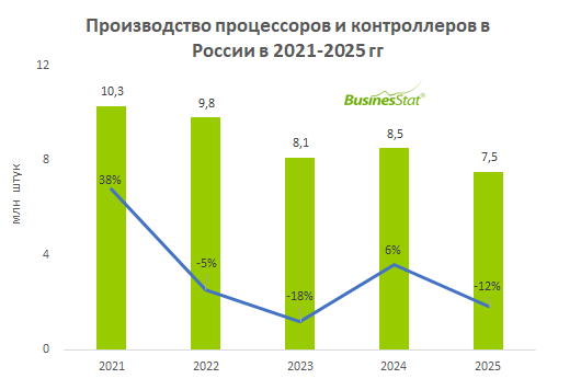 По данным «Анализа рынка процессоров и контроллеров в России», подготовленного BusinesStat в 2026 г, их выпуск в стране в 2025 г сократился на 12% в годовом выражении, составив 7,5 млн штук.
