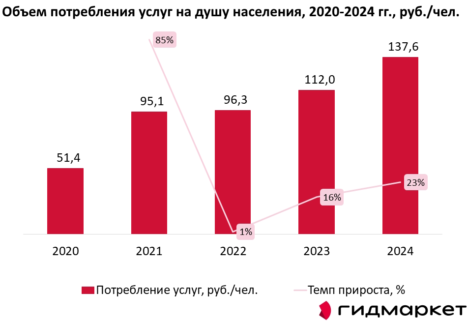Согласно полученным данным, наблюдается устойчивая восходящая динамика показателя. Так, в 2020 году объём потребления услуг по переработке твёрдых коммунальных отходов (ТКО) составлял 51,4 руб. на человека, тогда как к 2024 году данный показатель увеличился до 137,6 руб. на человека. Таким образом, за пять лет потребление услуг на душу населения выросло почти в 2,7 раза.