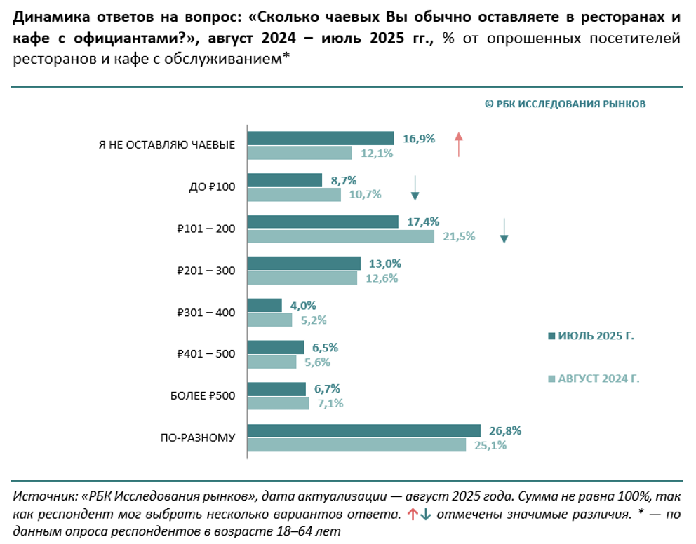 Несмотря на то, что чаевые остаются распространенной практикой, происходит смещение в сторону более сдержанного и рационального подхода к расходам.Согласно данным, приведенным в обзоре «Российский рынок ресторанов среднего ценового сегмента 2025», за последний год доля гостей, полностью отказывающихся от чаевых, выросла с 12,1% до 16,9%.