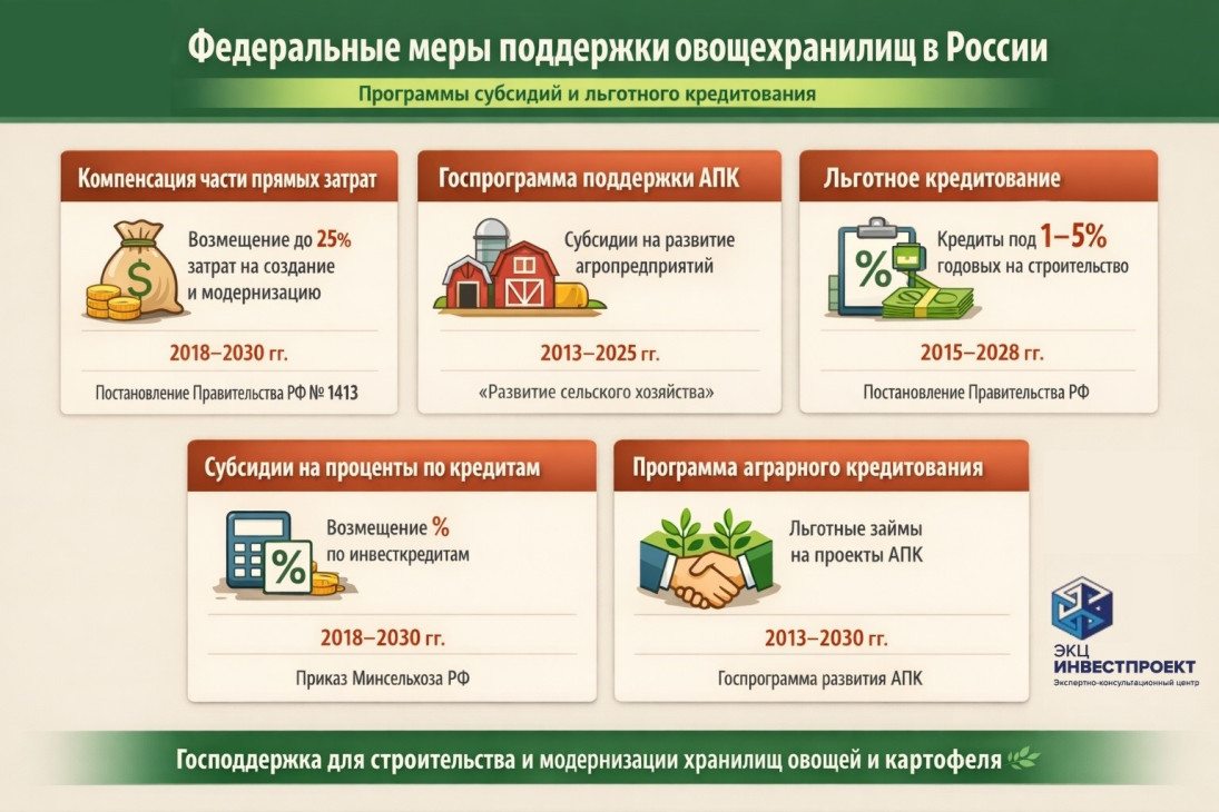 Возмещение части прямых затрат на создание и модернизацию объектов агропромышленного комплекса (в т. ч. хранилищ овощей и картофеля). Размер компенсации может достигать до определённого процента фактических затрат (например, до 25 % согласно практическим параметрам) — конкретные лимиты и механизмы определяются нормативами и приказами Минсельхоза. |