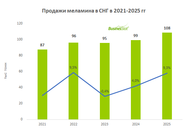 По данным «Анализа рынка меламина в странах СНГ», подготовленного BusinesStat в 2026 г, в 2025 г его продажи в странах СНГ выросли на 9% до 108 тыс т. Ключевой игрок на рынке меламина в регионе среди стран – Россия.