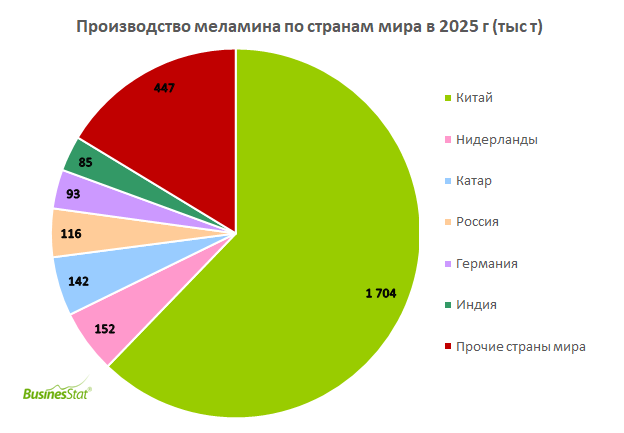 По данным «Анализа мирового рынка меламина», подготовленного BusinesStat в 2026 г, в 2025 г его производство в мире выросло на 3% и достигло 2 740 тыс т.