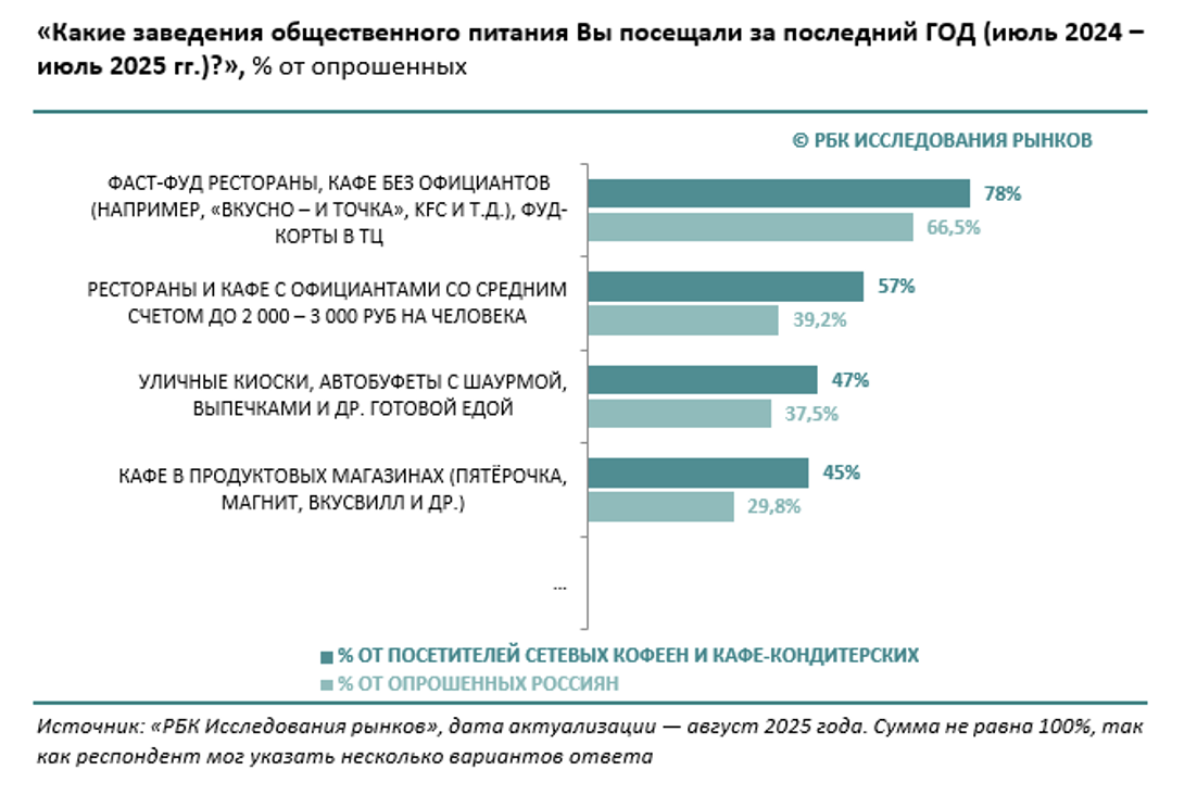 Сетевые супермаркеты активно развивают направление готовой еды (ready-to-eat) и кафе внутри магазинов, предлагая потребителю более низкую цену и высокую скорость обслуживания. Статистика, приведенная в обзоре «Российский рынок кофеен и кафе-кондитерских 2025», подтверждает: аудитория кофеен не ограничивается одним форматом и активно переключается на предложения конкурентов.