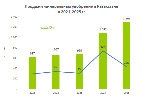 По данным «Анализа рынка минеральных удобрений в Казахстане», подготовленного BusinesStat в 2026 г, за 2021-2025 гг их продажи в стране увеличились в 2,1 раза и достигли 1,3 млн т.