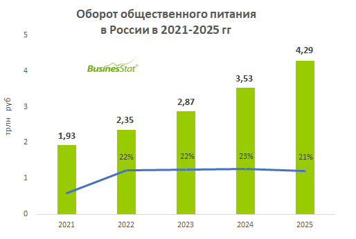 По данным «Анализа рынка общественного питания в России», подготовленного BusinesStat в 2026 г, в 2021-2025 гг оборот этого рынка в стране увеличился в 2,2 раза: с 1,93 до 4,29 трлн руб. С одной стороны, на фоне удорожания ингредиентов, аренды, оборудования и зарплаты персонала повышался средний чек.