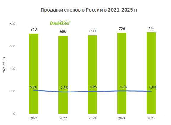 По данным «Анализа рынка снеков в России», подготовленного BusinesStat в 2026 г, за 2023-2025 гг их продажи в стране выросли на 4% и достигли 726 тыс т. Рынок восстанавливался после спада в 2022 г. Стабильный спрос на снеки поддерживался благодаря ускоряющемуся темпу жизни. Еще одной причиной популярности снеков является потребность людей в эмоциональной и психологической разгрузке: для многих важным мотивом покупки является стремление «побаловать себя».