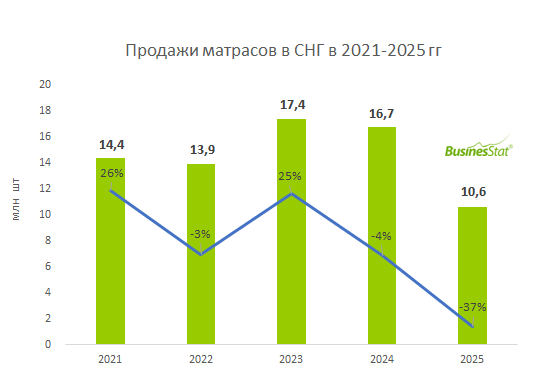 По данным «Анализа рынка матрасов в странах СНГ», подготовленного BusinesStat в 2026 г, в 2024-2025 гг их продажи в странах СНГ сократились на 39% по отношению к 2023 г и в 2025 г составили 10,6 млн шт. Ключевое влияние оказала нисходящая динамика объемов реализации в России в условиях общего насыщения рынка, снижения покупательной способности из-за высоких ставок по кредитам и замедления строительного сектора.