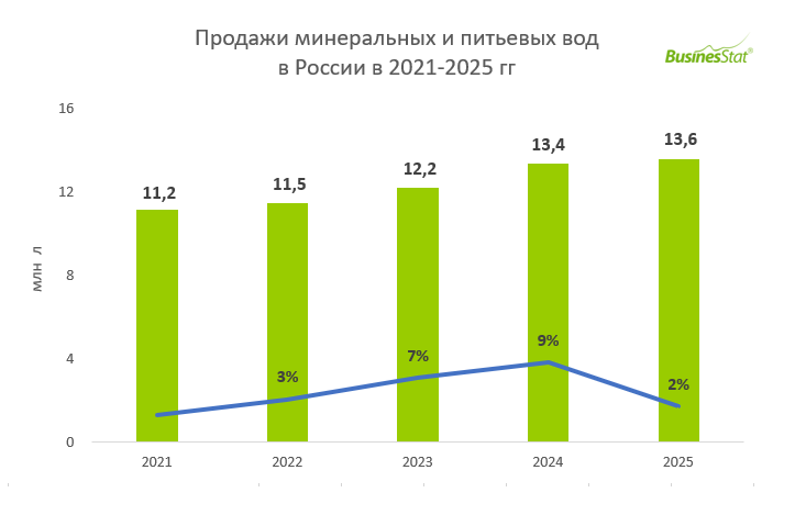 По данным «Анализа рынка минеральных и питьевых вод в России», подготовленного BusinesStat в 2026 г, в 2025 г их продажи в стране увеличились с 13,4 до 13,6 млрд л. Рост сдерживался по причине серьезной конкуренции бутилированной воды с питьевой водой в розлив, а также другими прохладительными напитками. Питьевая вода в розлив дешевле бутилированной и часто сопоставима по качественным характеристикам. Кроме того, в условиях ограниченной платежеспособности потребителей альтернативой бутилированной воды является также вода из-под крана, качество которой может быть улучшено с помощью фильтров.