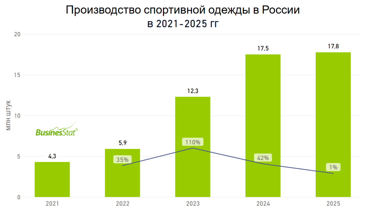 По данным «Анализа рынка спортивной одежды в России», подготовленного BusinesStat в 2026 г, ее выпуск в 2025 г вырос на 1%: с 17,5 до 17,8 млн шт.